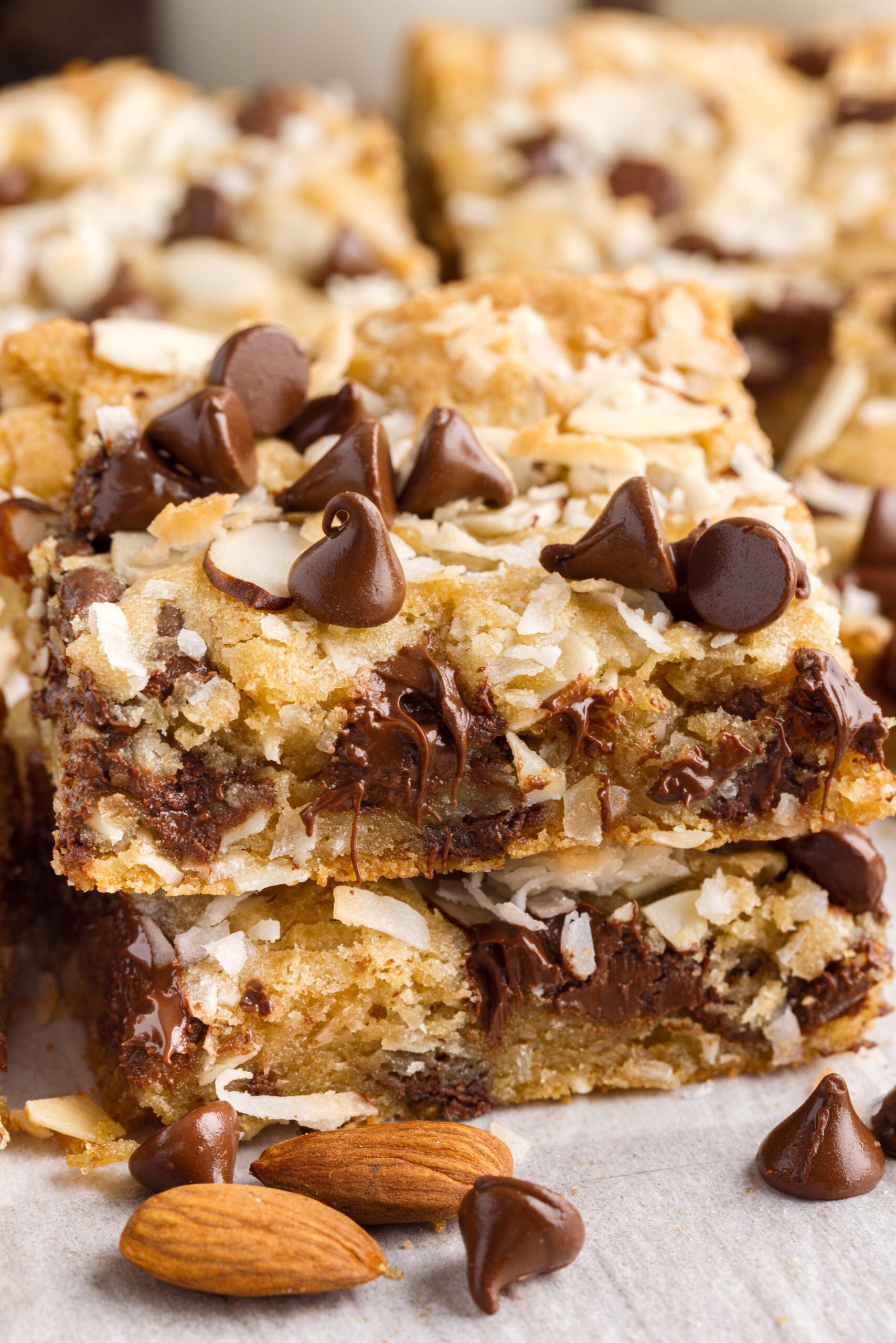 4. Press a whole almond onto the top of each bar.