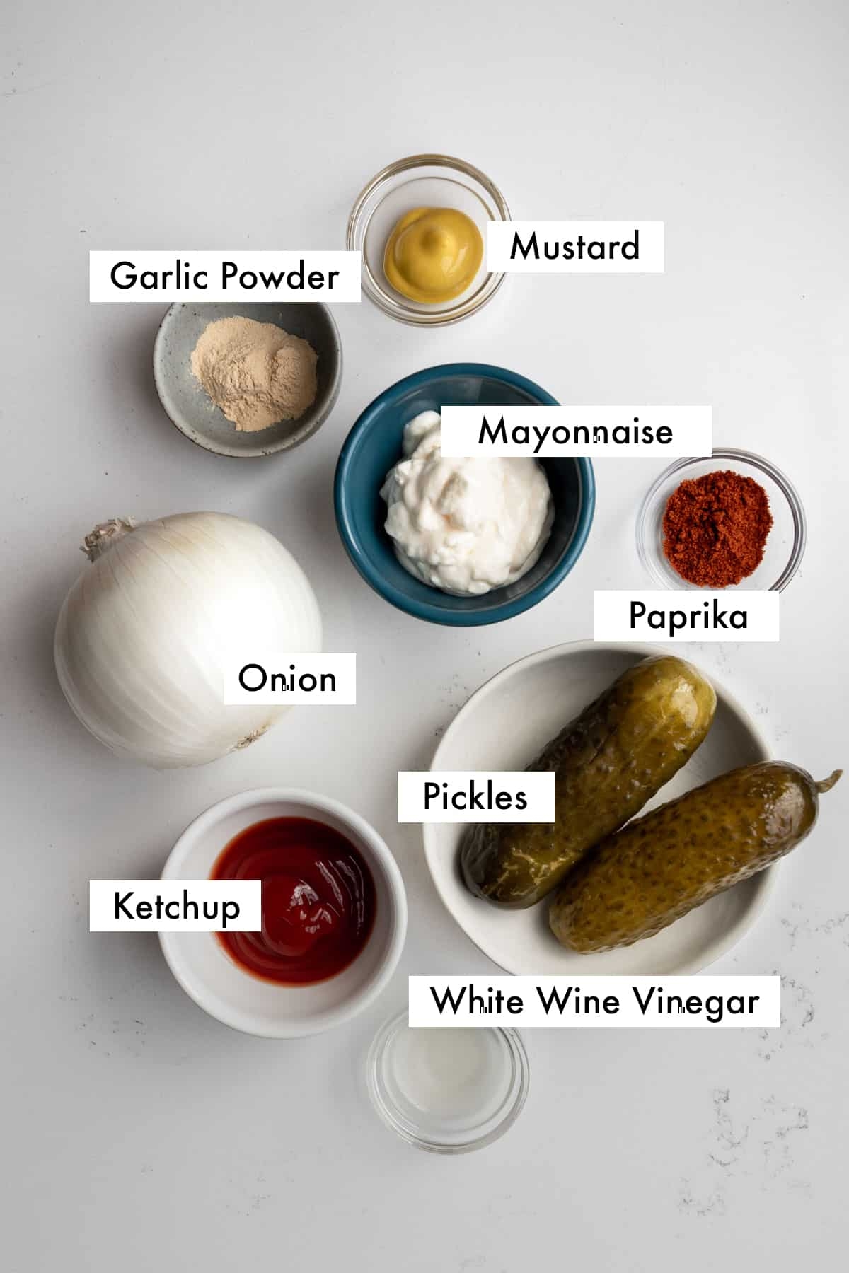 1. In a small bowl, combine the mayonnaise, pickles, mustard, vinegar, paprika, onion powder, and garlic powder.