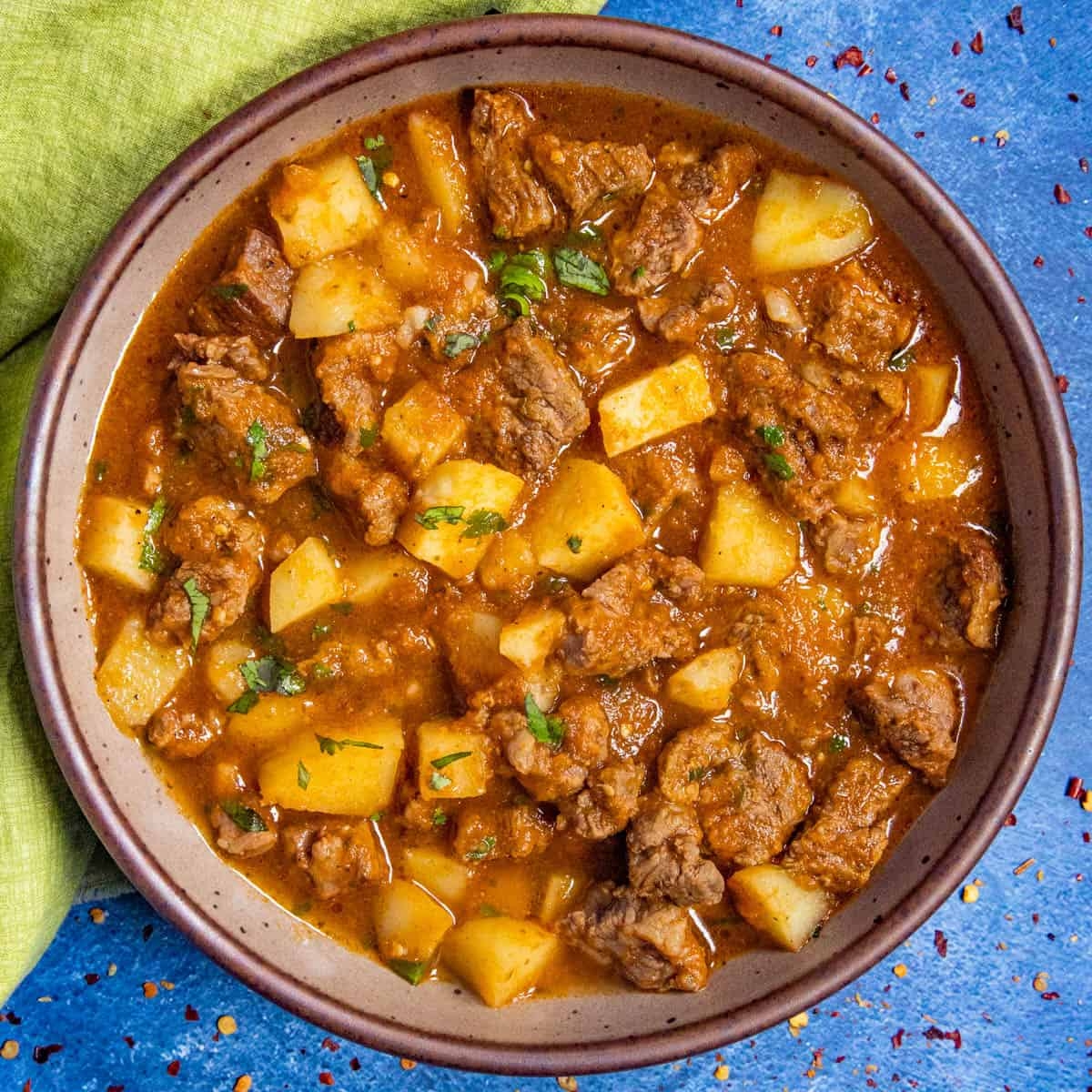9. Serve the carne con papas hot, garnished with fresh cilantro or parsley.