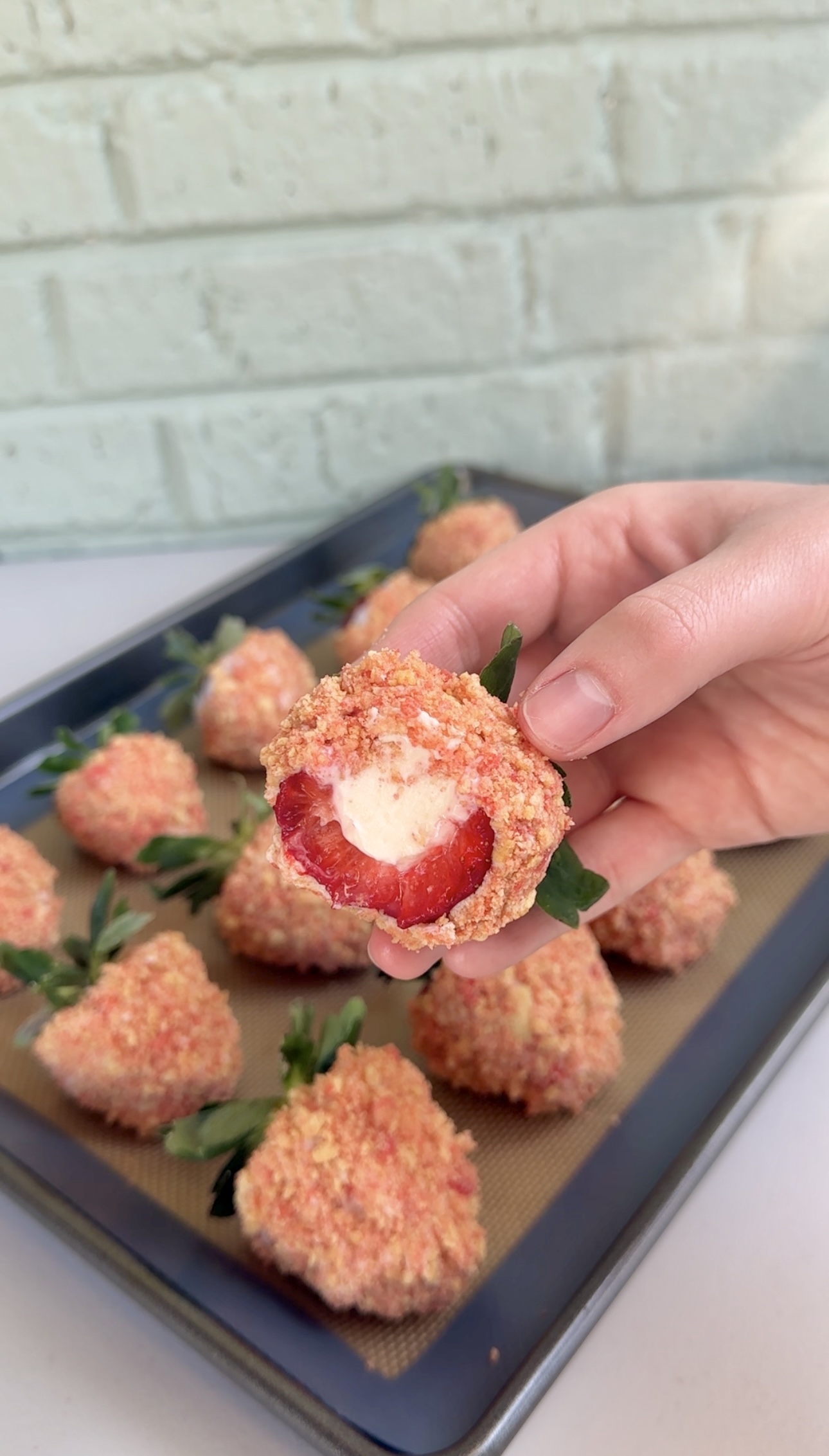 3. Spoon or pipe the cream cheese mixture into each strawberry, filling the hollowed-out center.