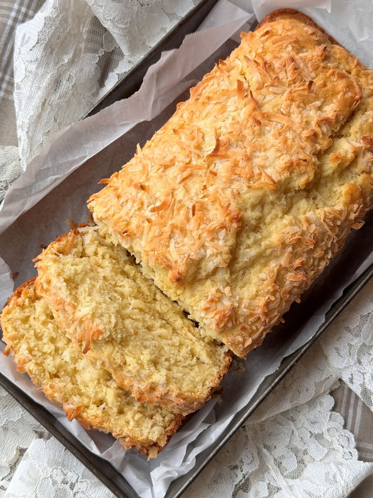 9. Serve the coconut bread sliced and enjoy with a cup of tea or coffee.