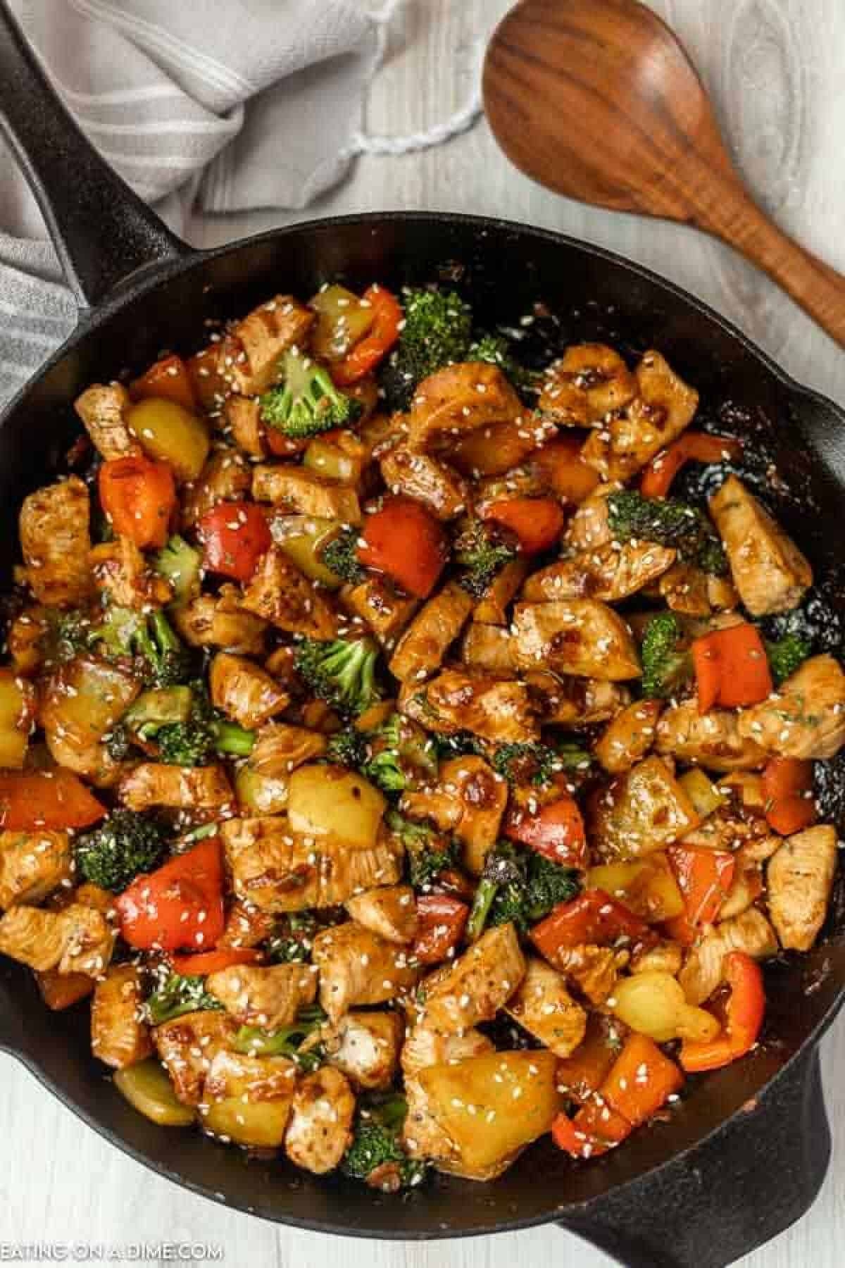 9. Toss everything together until the chicken and vegetables are coated in the sauce.