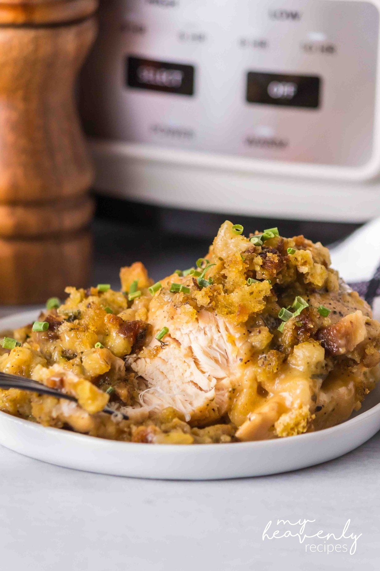 9. Serve hot, spooning gravy from the crockpot over the chicken and stuffing.