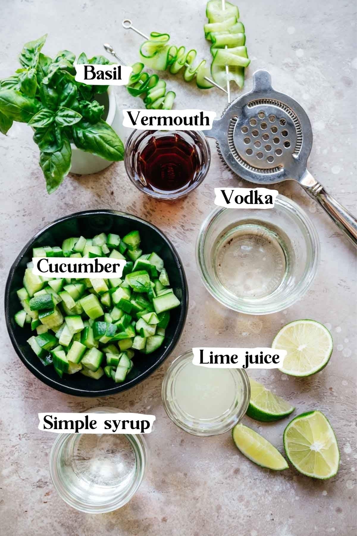 2. Add the cucumber-infused vodka, dry vermouth, and simple syrup to the shaker.
