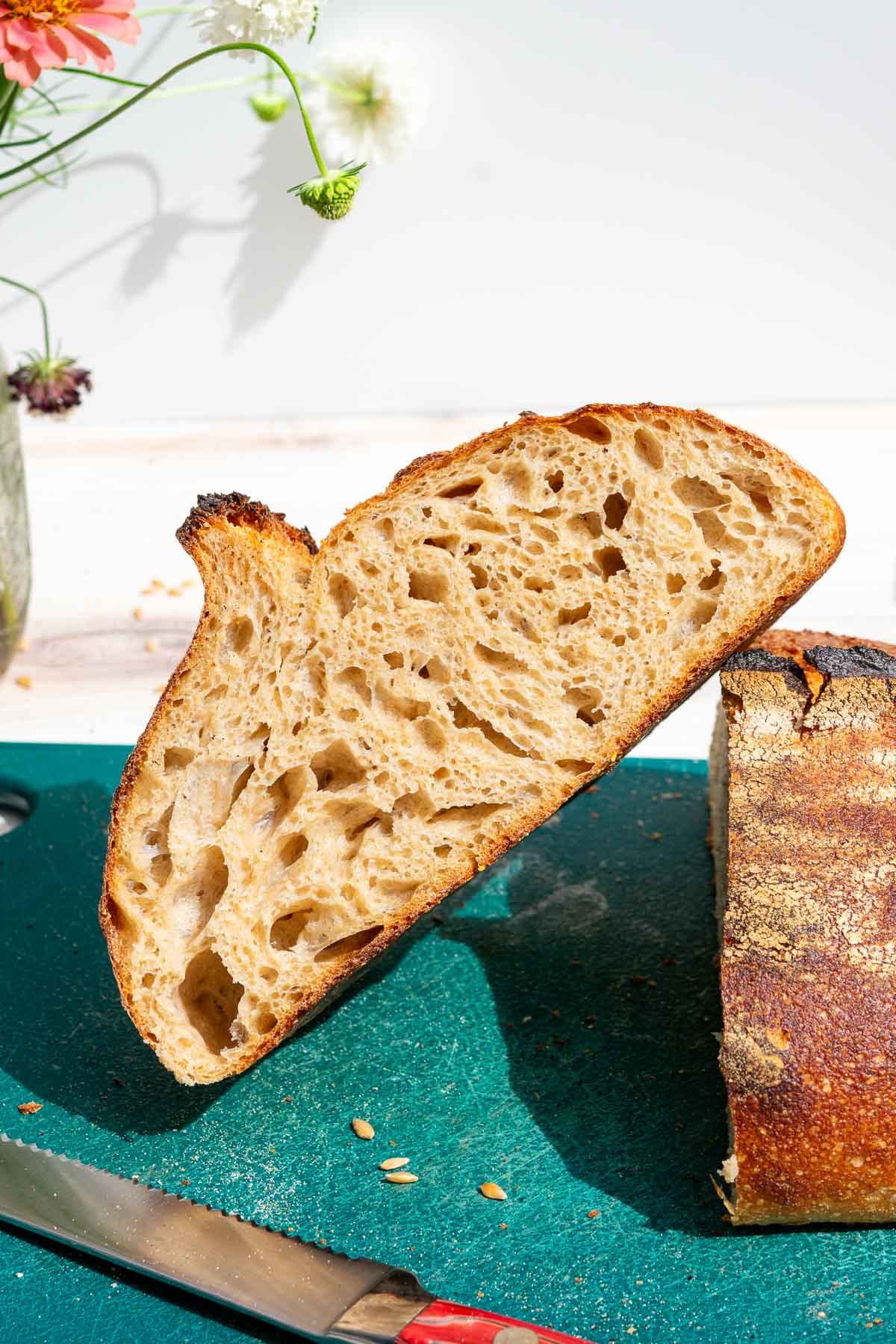 Serve the einkorn flour bread toasted with a spread of butter or avocado for a simple and satisfying snack. It also pairs well with soups, salads, and sandwiches for a wholesome meal.