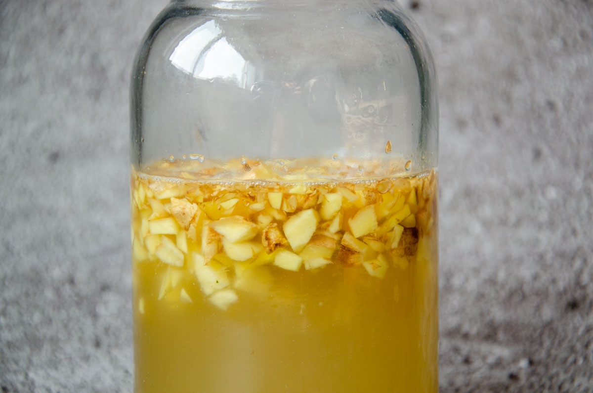 1. In a glass jar, combine the grated ginger, sugar, and water.