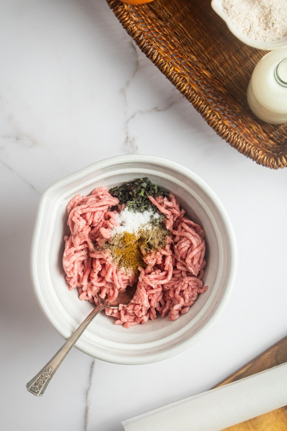 1. In a large mixing bowl, combine the ground pork, salt, pepper, sage, thyme, red pepper flakes, garlic powder, onion powder, and paprika.