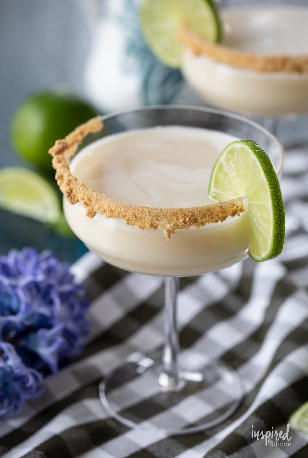 1. Begin by rimming a martini glass with graham cracker crumbs. To do this, rub a lime wedge around the rim of the glass, then dip it into the graham cracker crumbs until the rim is coated.