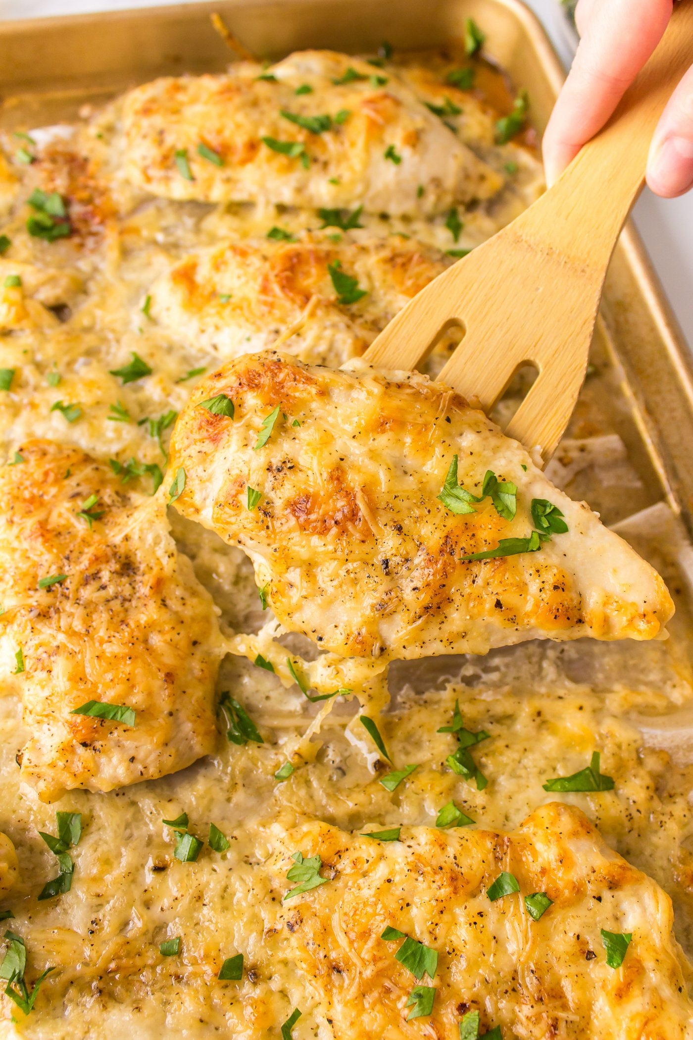 9. Serve the mayonnaise parmesan chicken hot with your favorite sides.
