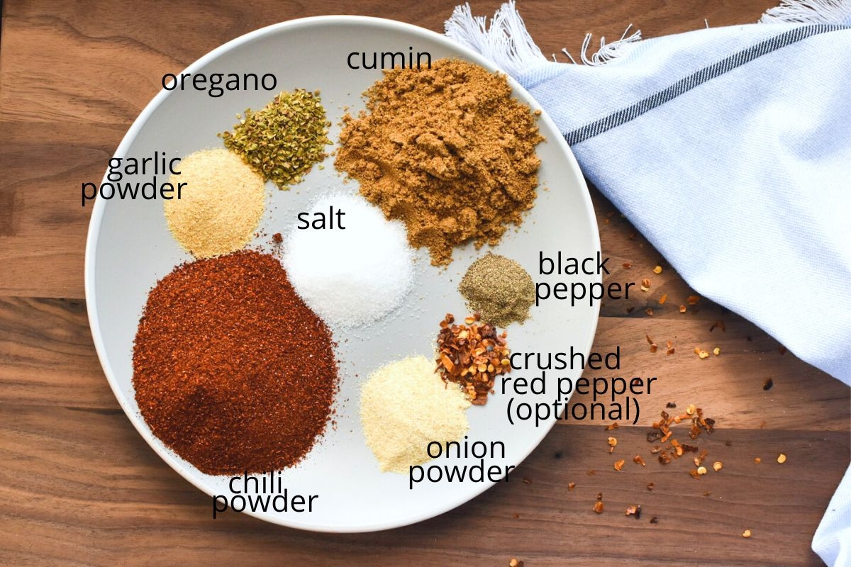 1. In a small bowl, combine all the spices: chili powder, cumin, paprika, garlic powder, onion powder, oregano, salt, and black pepper.