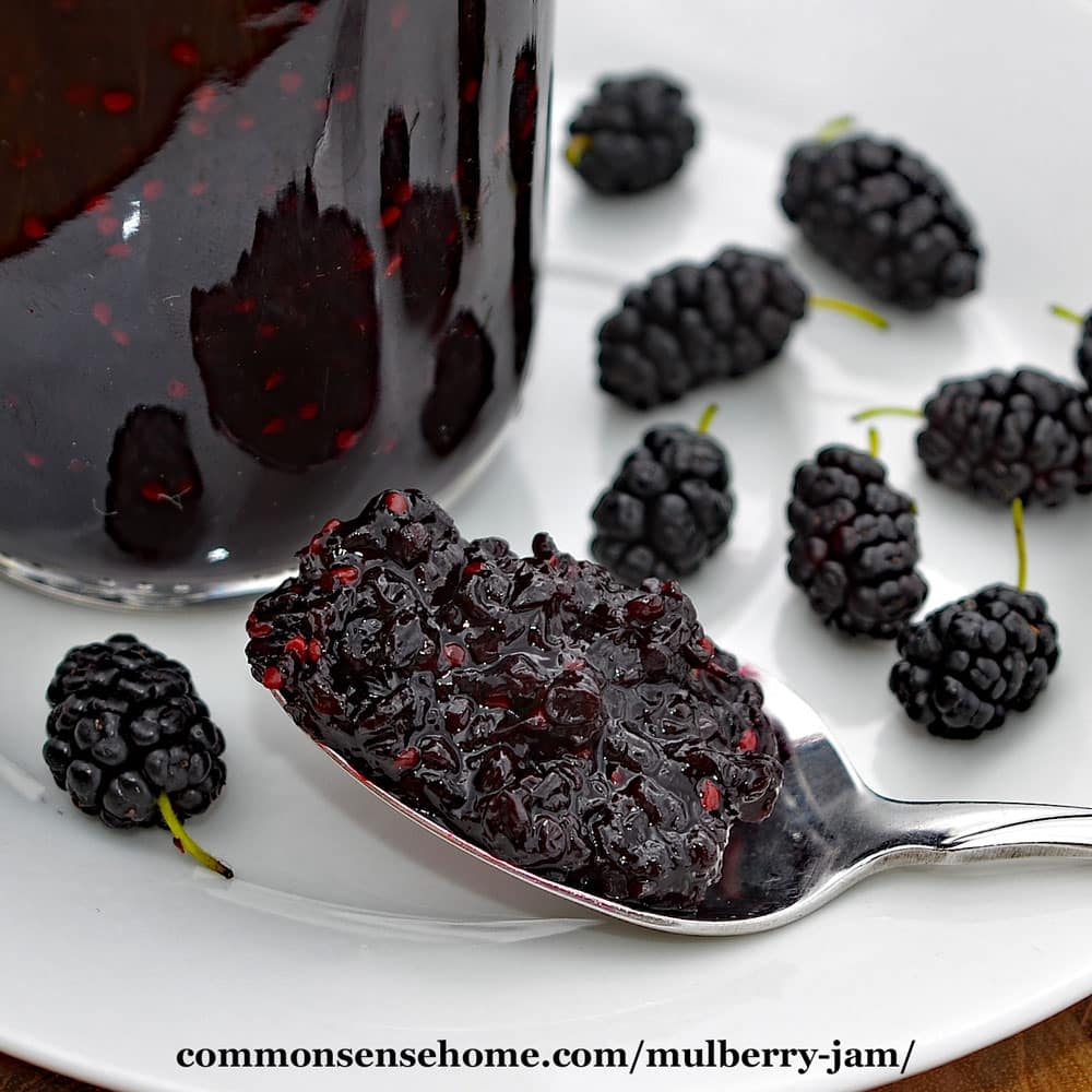 For a chunkier jam, leave some of the mulberries whole or partially crushed. To store the jam, keep it in a cool, dark place for up to one year. Serve this mulberry jam on warm biscuits, swirl it into oatmeal, or use it as a glaze for chicken or pork.