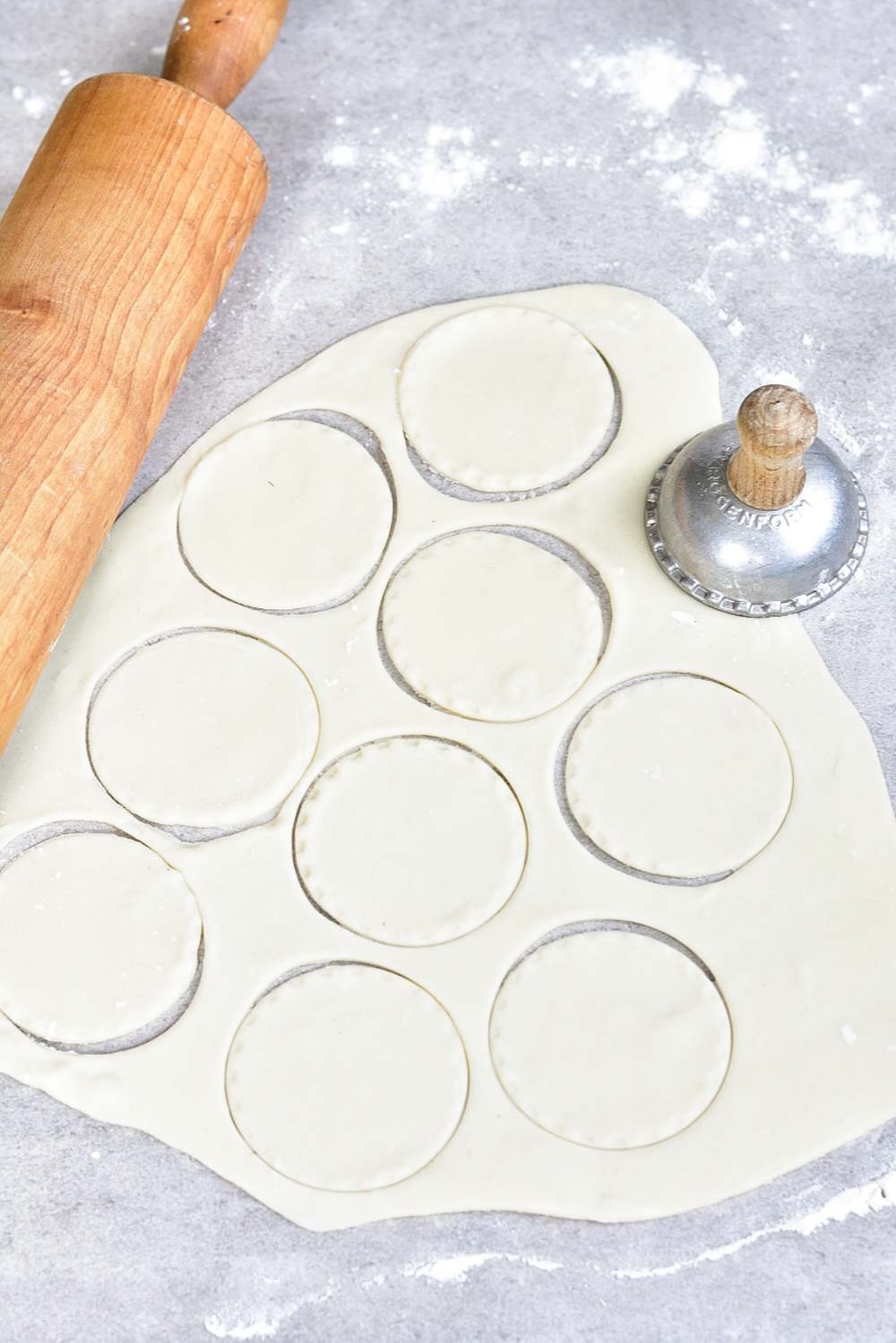 8. Roll the dough out to about 1/8 inch thickness, then use a round cutter to cut out circles for your pierogies.