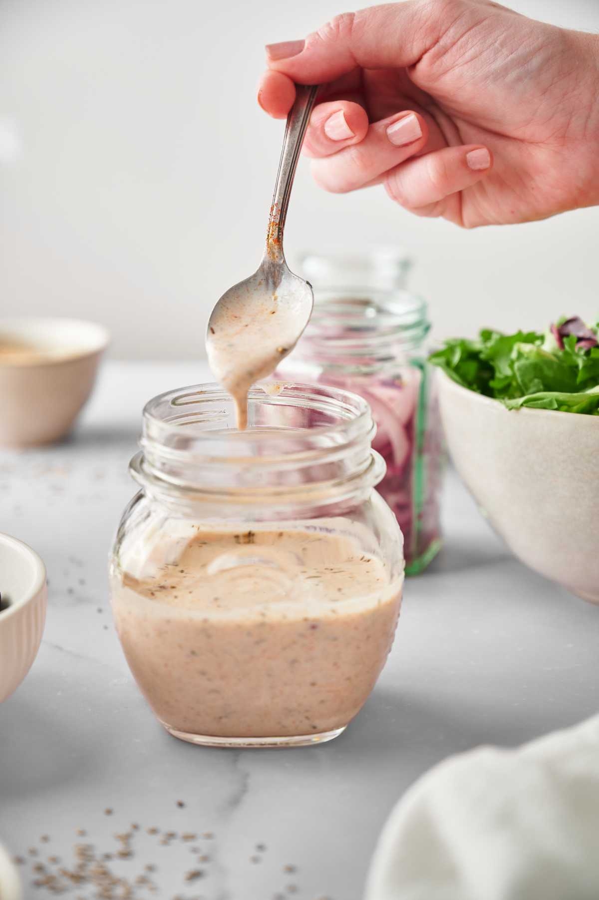 4. If the dressing is too thick, you can add a little bit of water to reach your desired consistency.