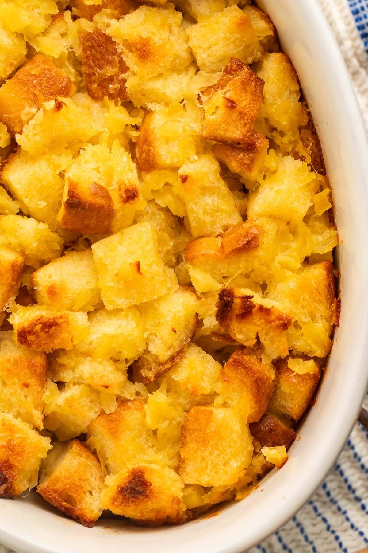 2. In a large bowl, combine the bread cubes and crushed pineapple.