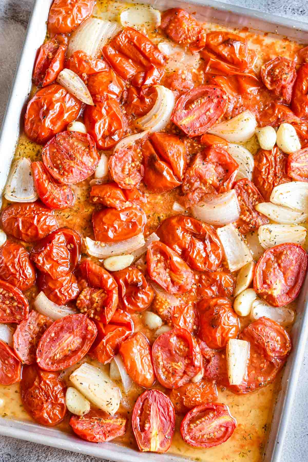 4. Roast the tomatoes in the oven for about 20-25 minutes until they are soft and slightly caramelized.