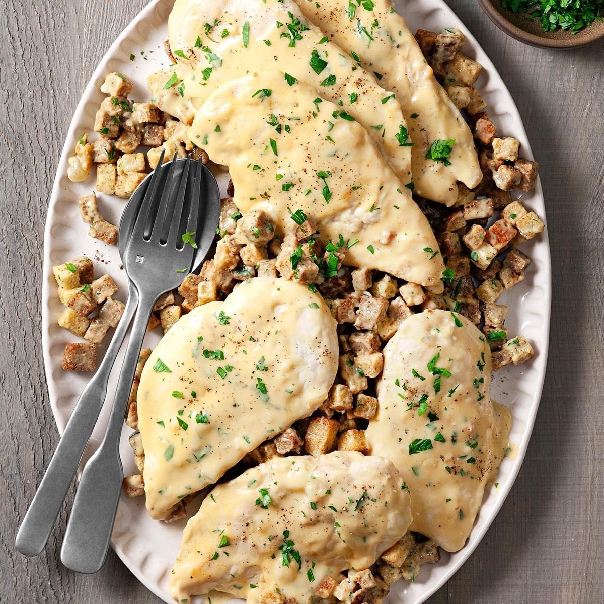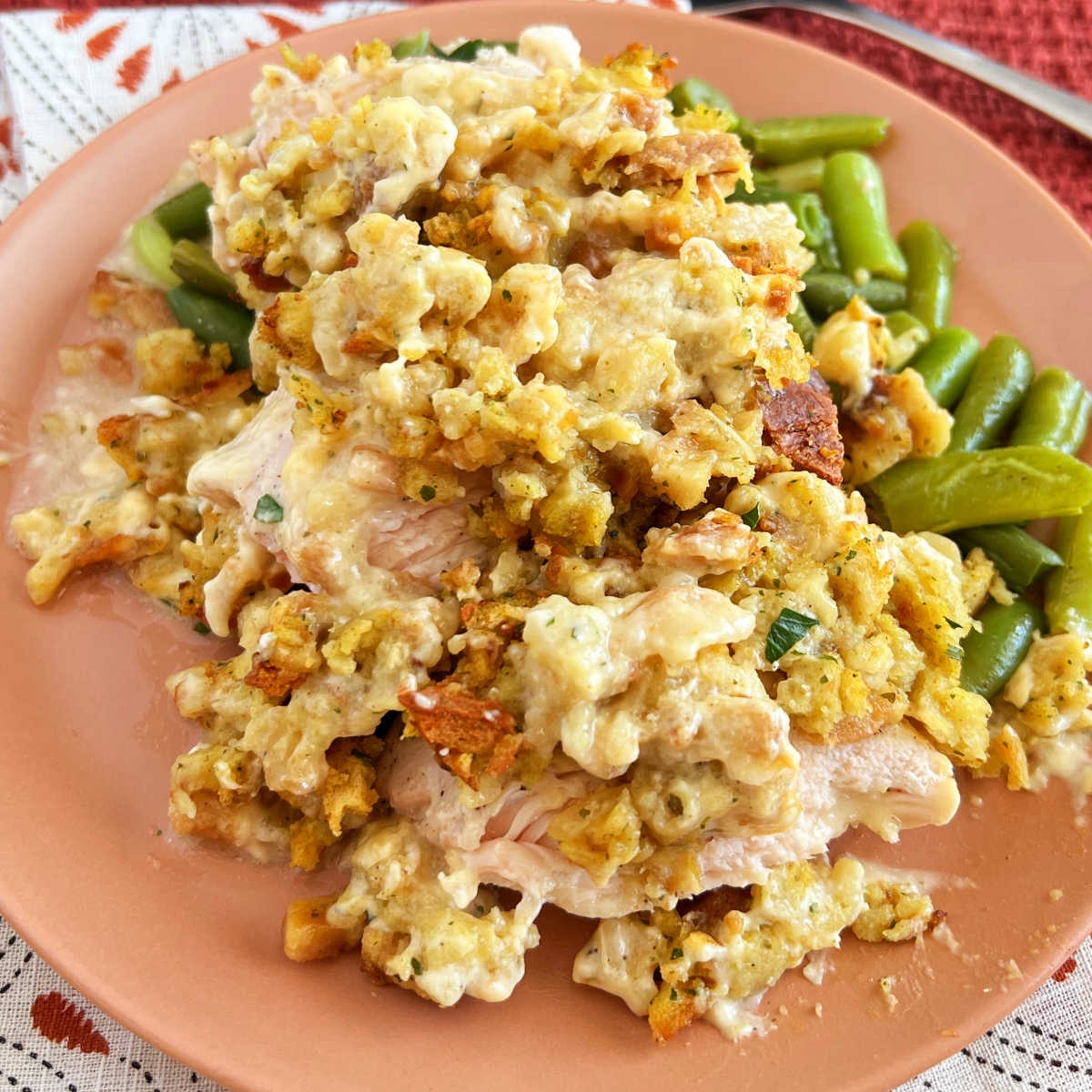 7. Once the chicken is cooked through and the stuffing is golden brown, it’s ready to serve.