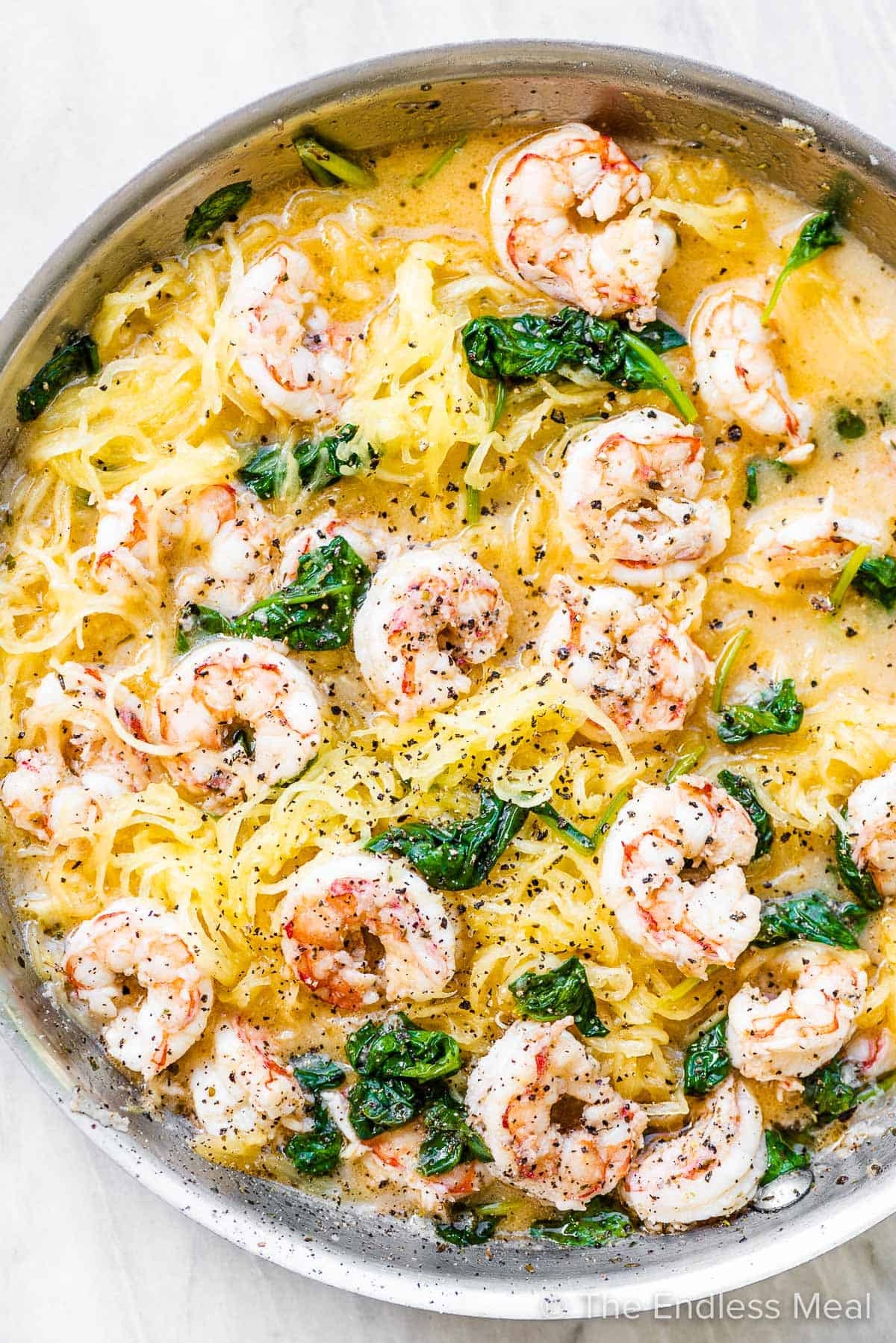 10. Add the spaghetti squash strands to the skillet with the shrimp.