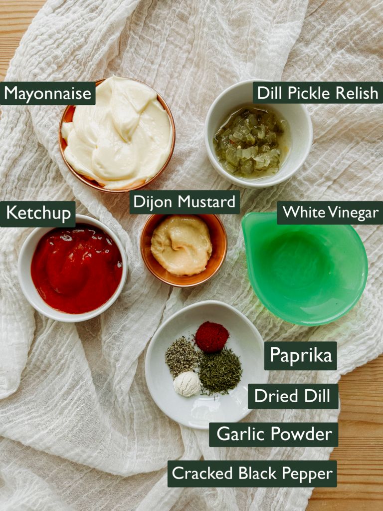 1. In a small bowl, combine the mayonnaise, ketchup, mustard, pickle relish, vinegar, garlic powder, and onion powder.