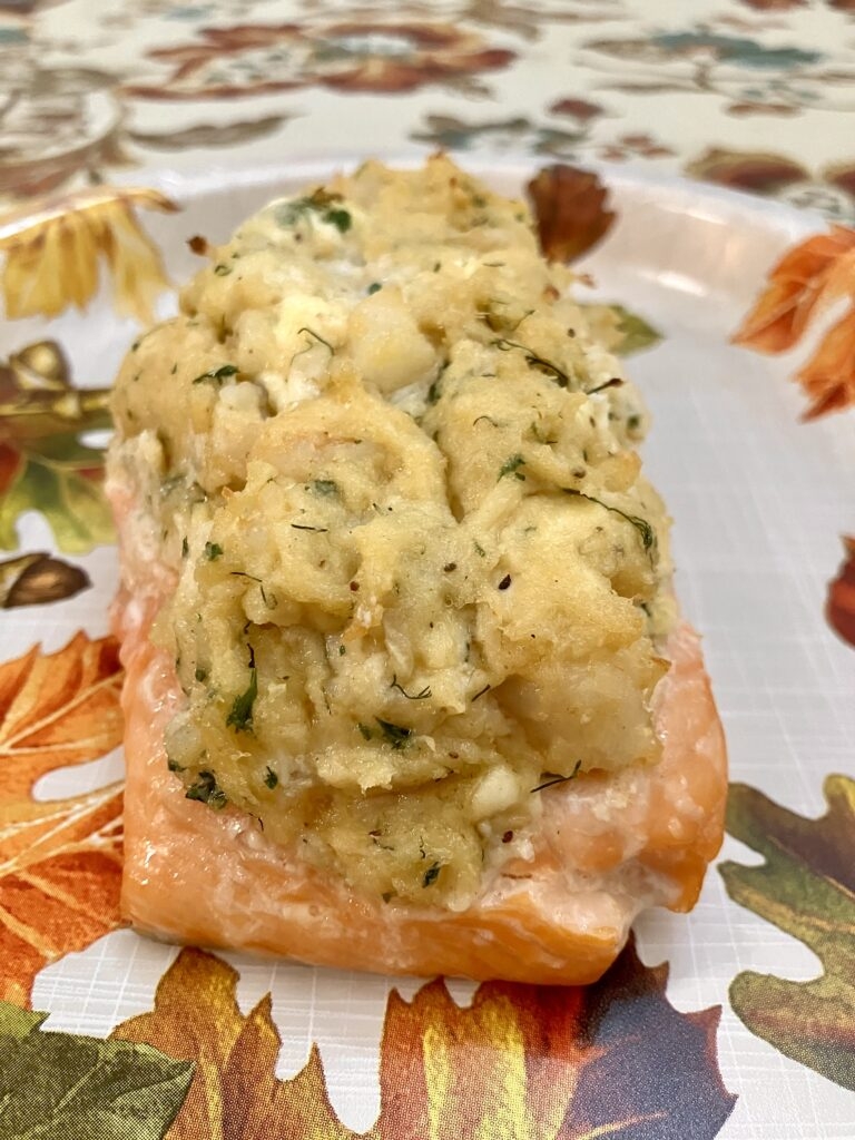 5. Stuff the crabmeat and shrimp mixture into the pocket of the salmon fillet.