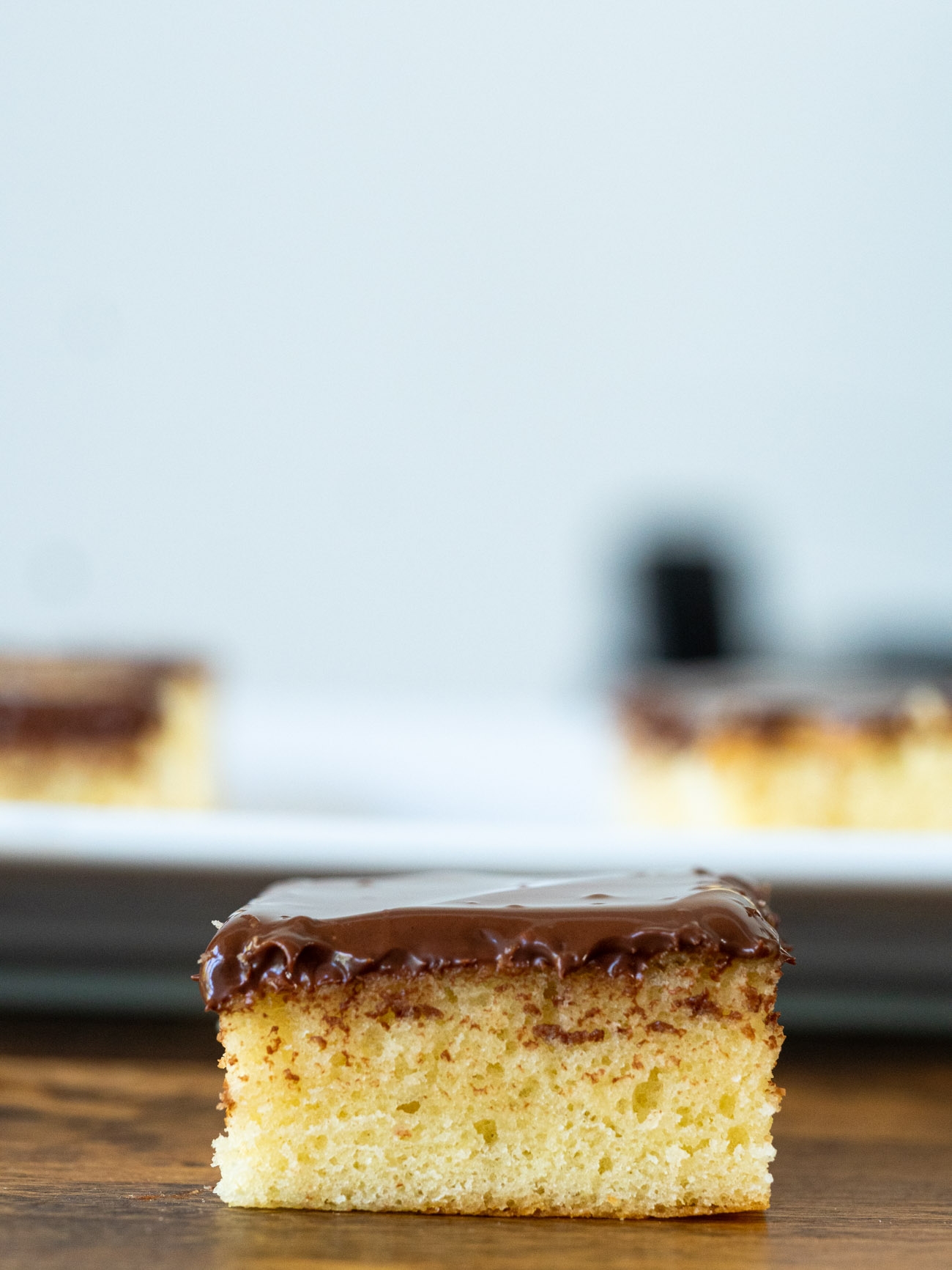 11. Once the chocolate has hardened, cut the cake into squares and serve.