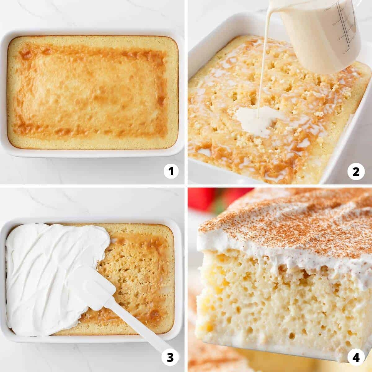 7. Slowly pour the milk mixture over the cake, making sure to cover the entire surface.