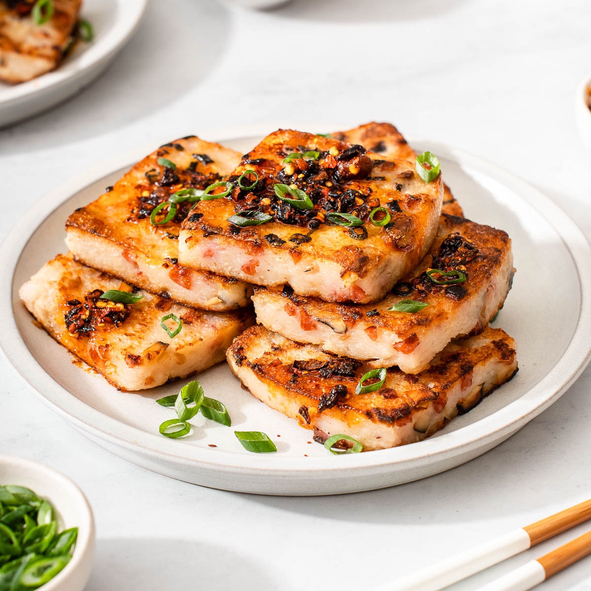 8. Serve the turnip cake hot, garnished with chopped green onions.