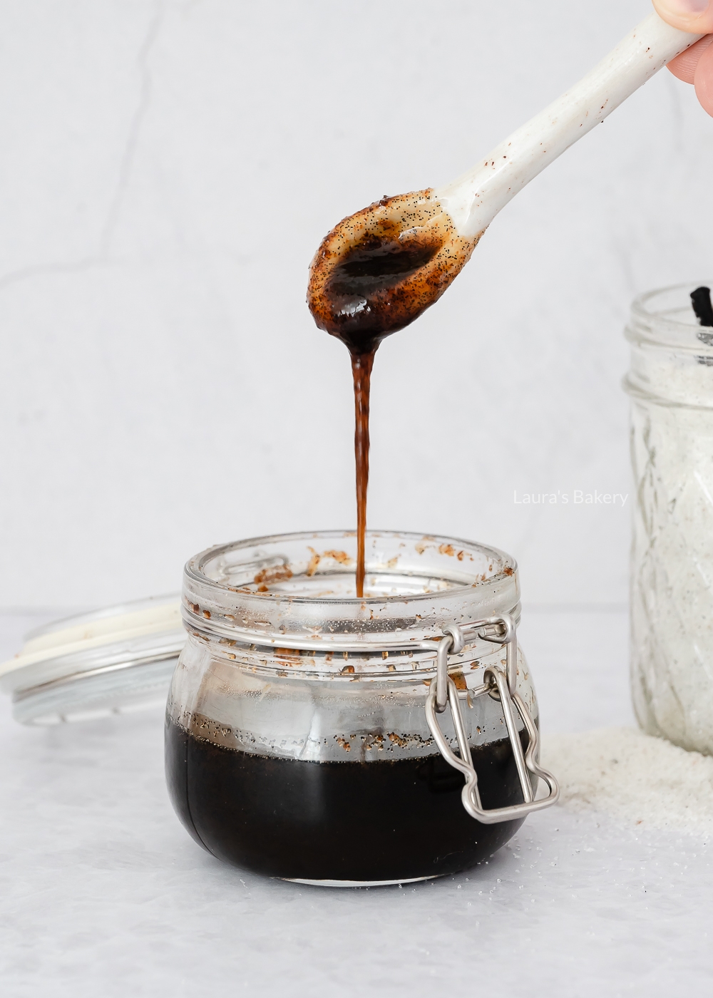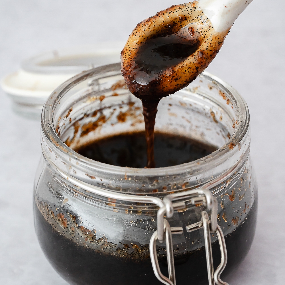 12. Pour the vanilla bean paste into a clean jar or container for storage.