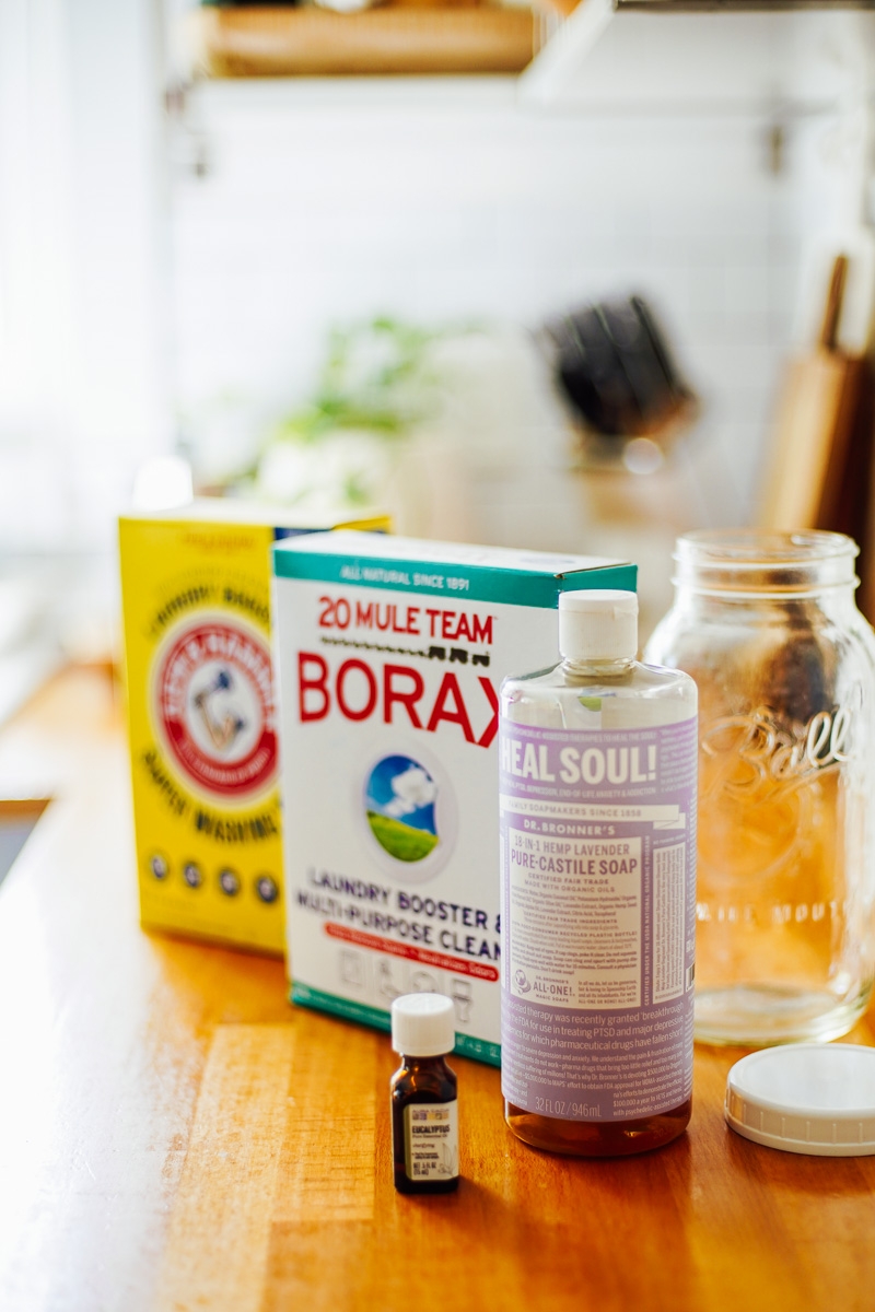 1. In a large bowl, combine the grated castile soap, washing soda, and borax.